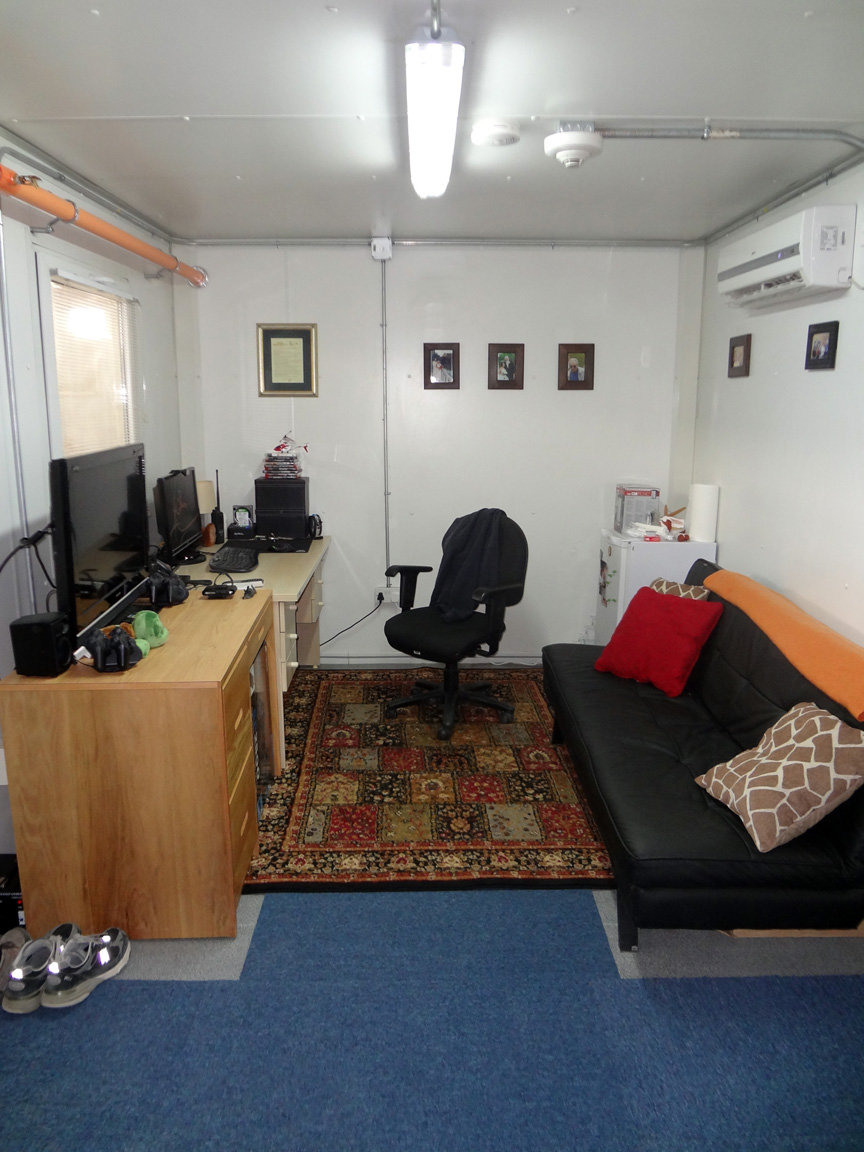 Below are two pictures of the inside of my CHU.  I figured you didn’t really need or want to see the bathroom.  But, rest assured that there is a bathroom with a shower in between those rooms.  I still have some more work, like hanging pictures and artwork on the walls (photos updated), to make it feel more like my space.  And of course it really isn’t one of my places until I put up Christmas lights year round, so those will be going up shortly too.