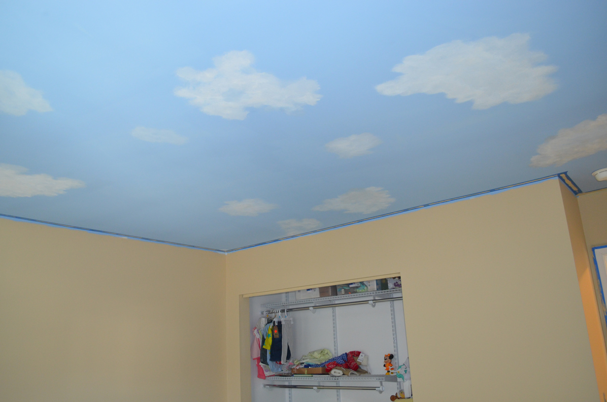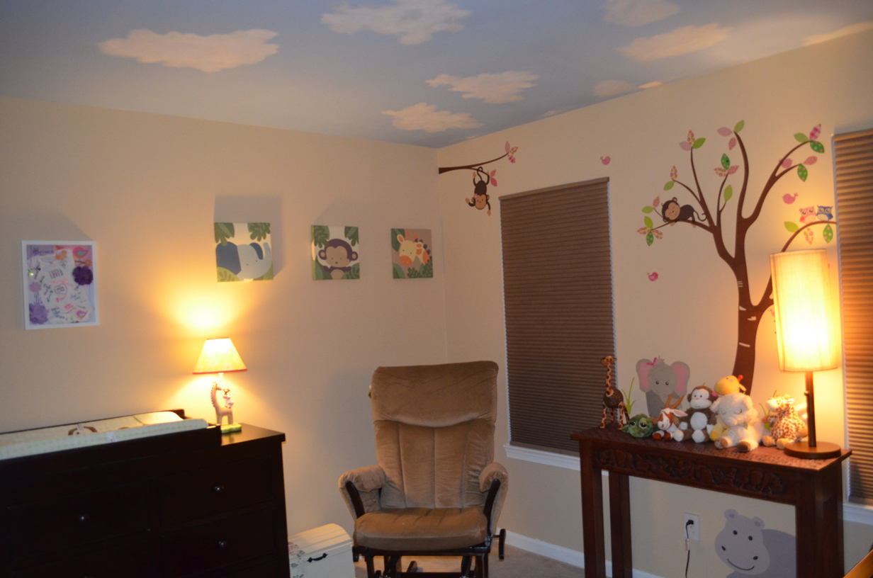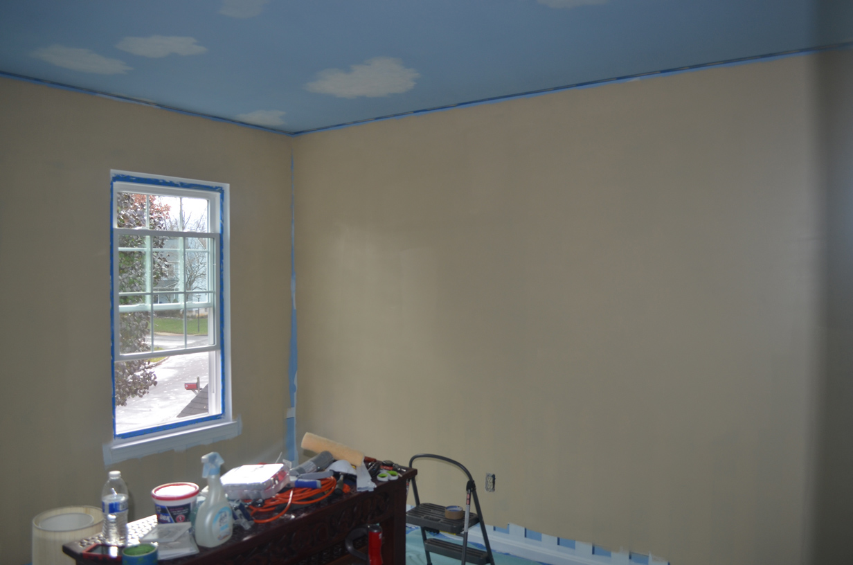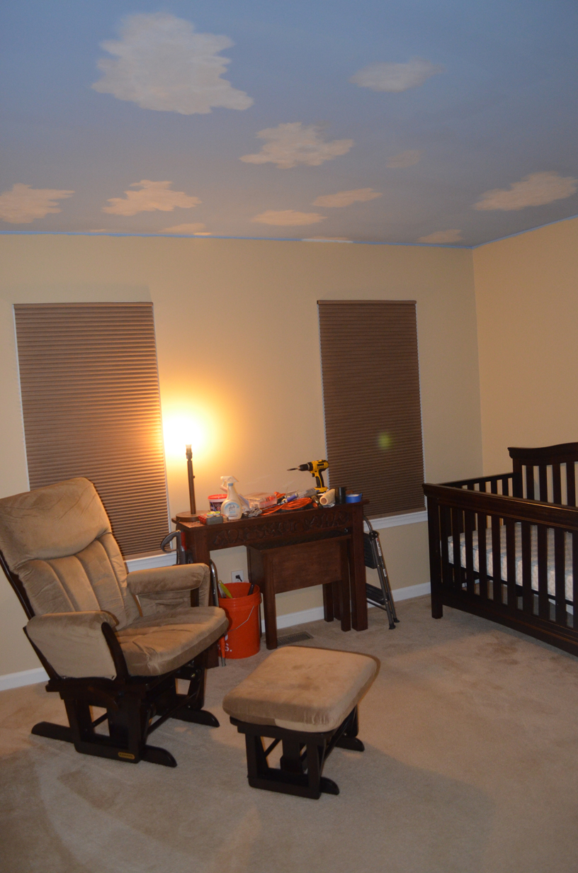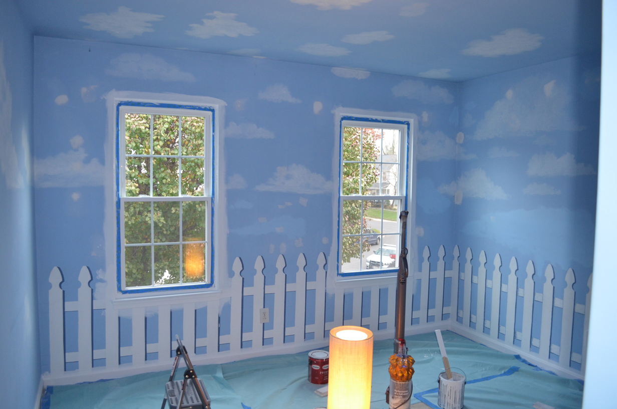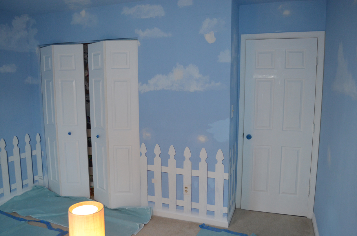 While we were looking for our future home, I was already planning the nursery in my mind and wanted to put clouds up on the ceiling (and fiber optic stars, but Melissa has pulled me back from that crazy plan). When the home that we decided on already had a room painted with clouds, we knew it was going to be the nursery. Once we moved in, we noticed a couple of issues with the clouds on the wall. First, the clouds were painted on the wall back in Jan 2003 so paint on the wall hasn’t stood up well against a decade of kids living in the room. Second, there were several places where the most recent owner did some patch work on the wall and there were spots of a different blue color. And third, the white picket fence didn’t really go with our jungle theme. Pictures are below of the original room.