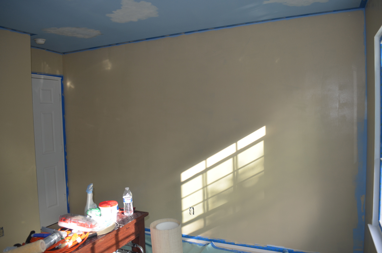 So we decided that we would paint the walls a light tan color so that it would fit more into the theme that we were shooting for. So I went to town doing around three coats of paint onto the walls. Below are the pictures I think around coat 1 or 2