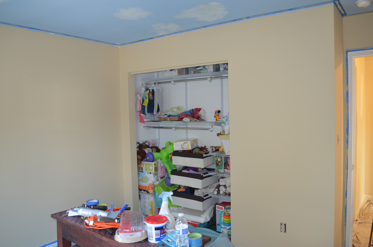 We also completely redid the closet. Removing the old “system” that the previous owners had installed. Patching, painting, and then installing a new system into the closet that could expand and change as our little one grew to accommodate different stages of life. Below is a picture of the closet with the new system in it (although messy as everything was put into the closet so that I could paint the room).