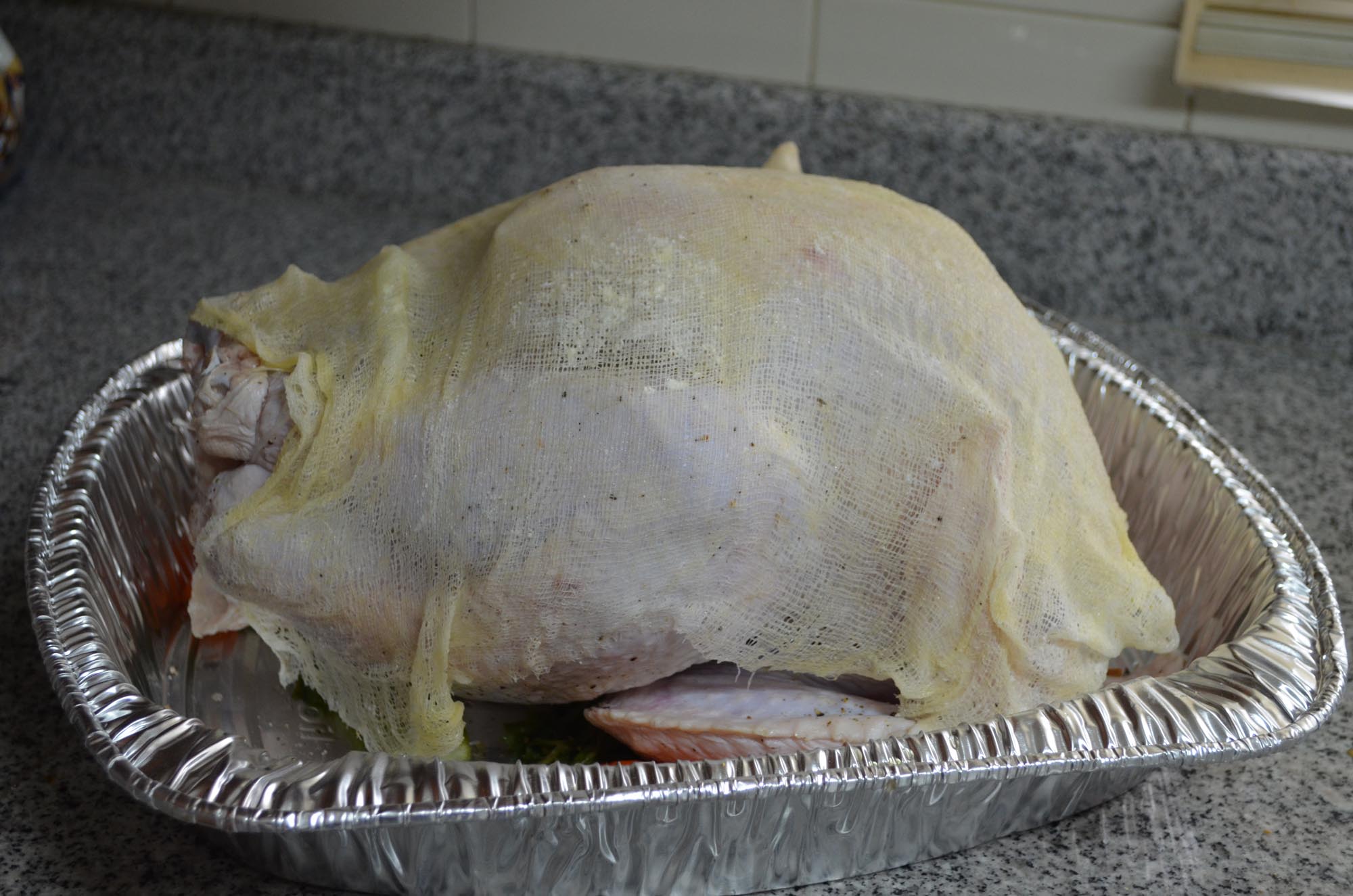 I covered the turkey with a cheesecloth that had been soaking in wine and melted butter.