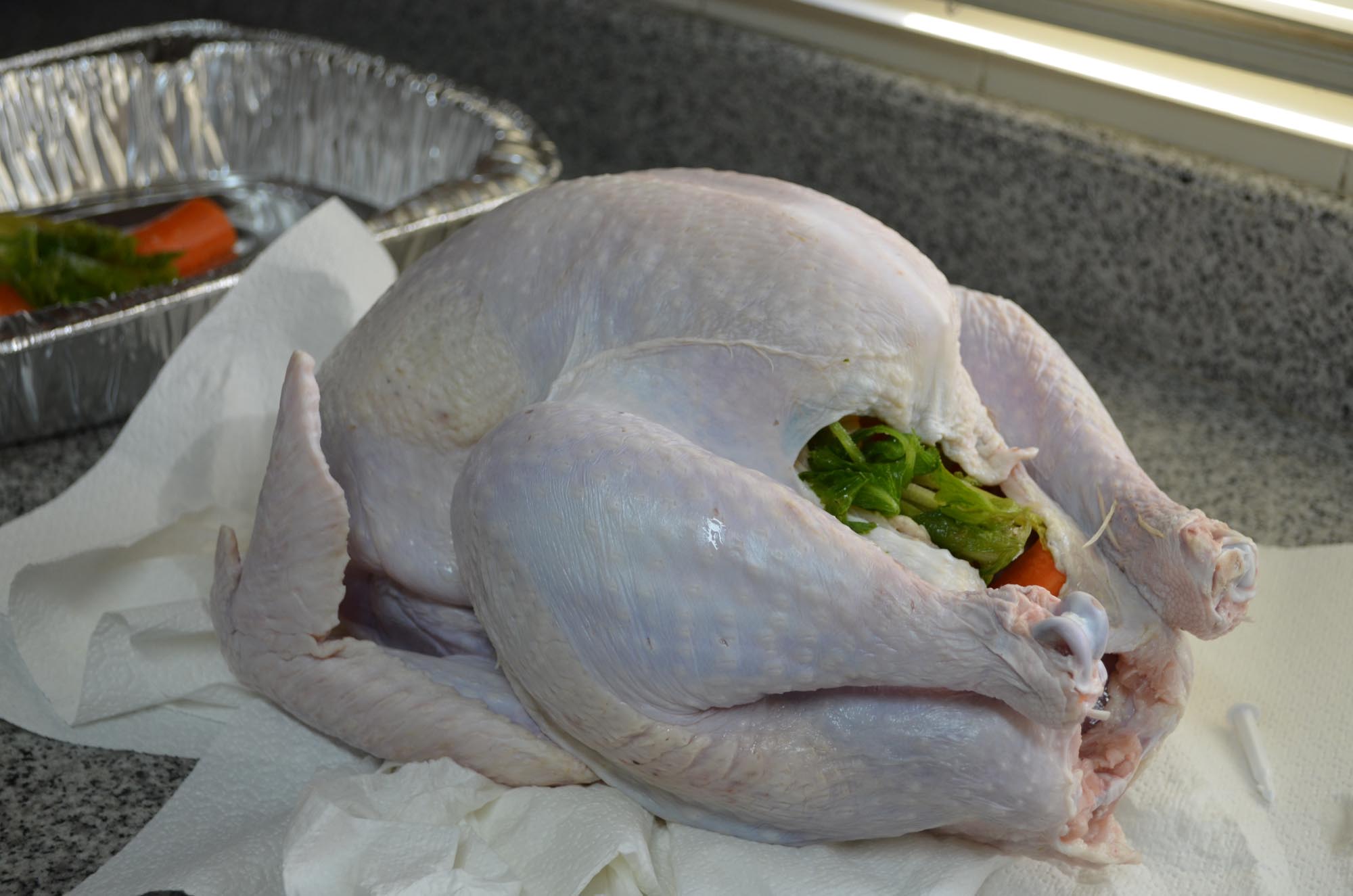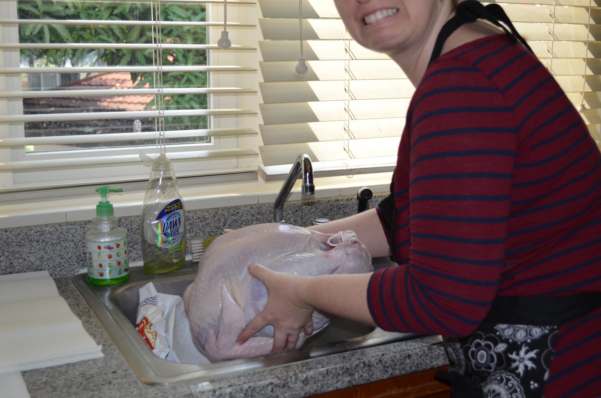 I did everything I could do ahead of time to possibly delay this moment as long as possible, I chopped up the veggies, herbs and spices, prepared the roasting pan, and made a nice work space on my counter, but the moment I had been dreading the most was finally here. I had to take the turkey out of the packaging and wash it.